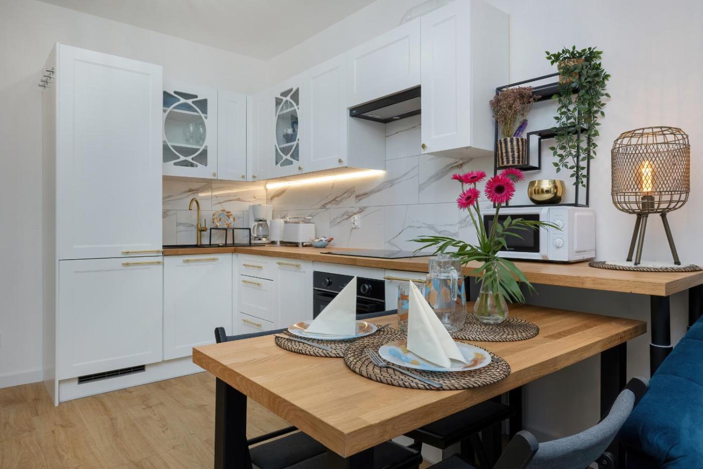 Oferta apartamentu obejmuje sypialnię (1), salon, aneks kuchenny z pełnym wyposażeniem, w tym lodówką i ekspresem do kawy, a także łazienkę (1) z prysznicem oraz bezpłatnym zestawem kosmetyków. W apartamencie zapewniono ręczniki i pościel.